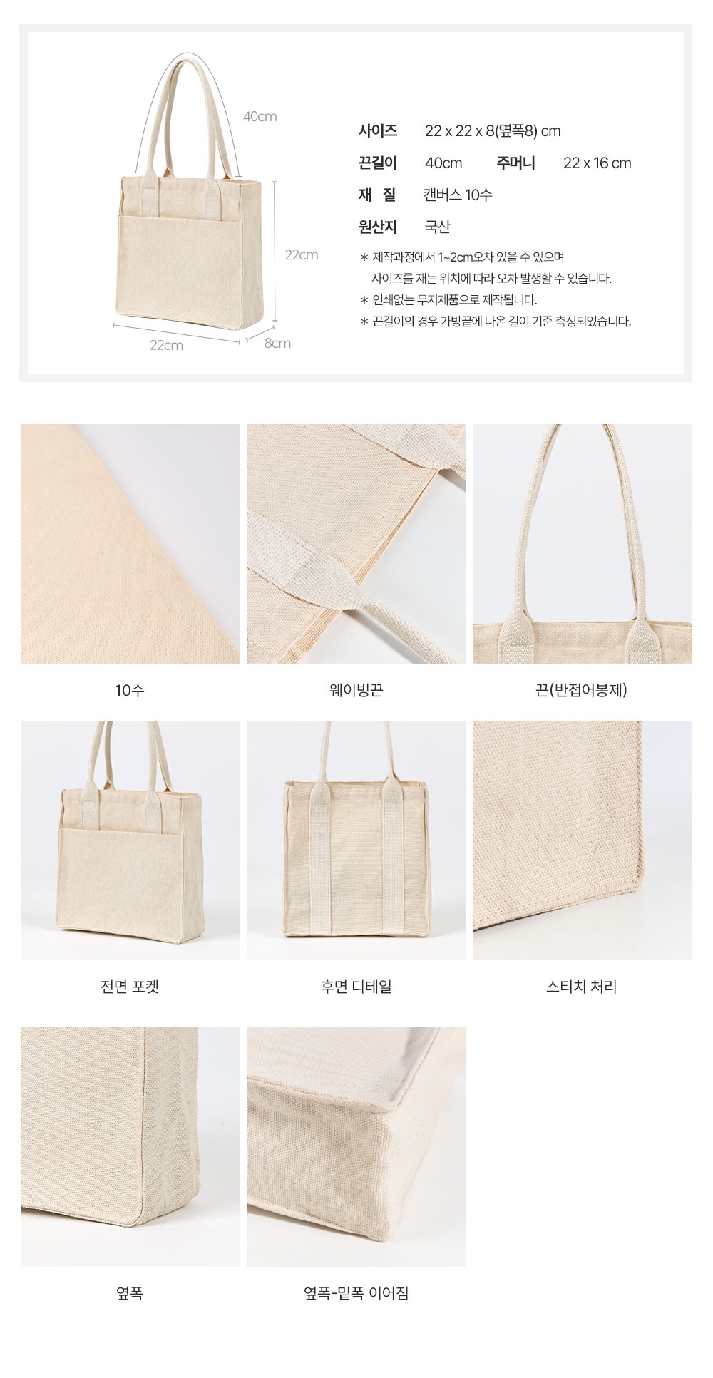 맞춤제작 휴대용 에코백 22*22*8mm (최소 100개) (원단, 끈 컬러 선택가능)
