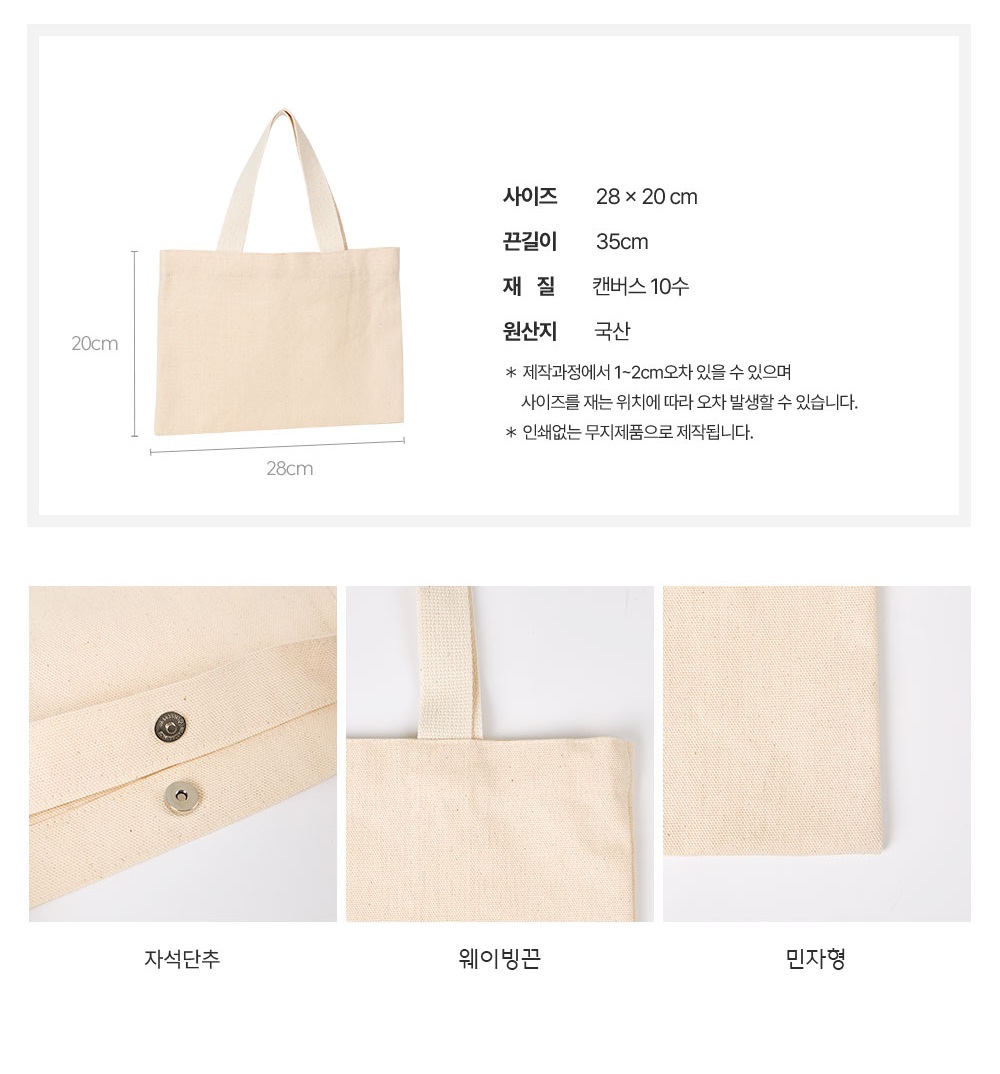 맞춤제작 자석형 에코백 22*20cm (최소 100개) (원단, 끈 컬러 선택가능)